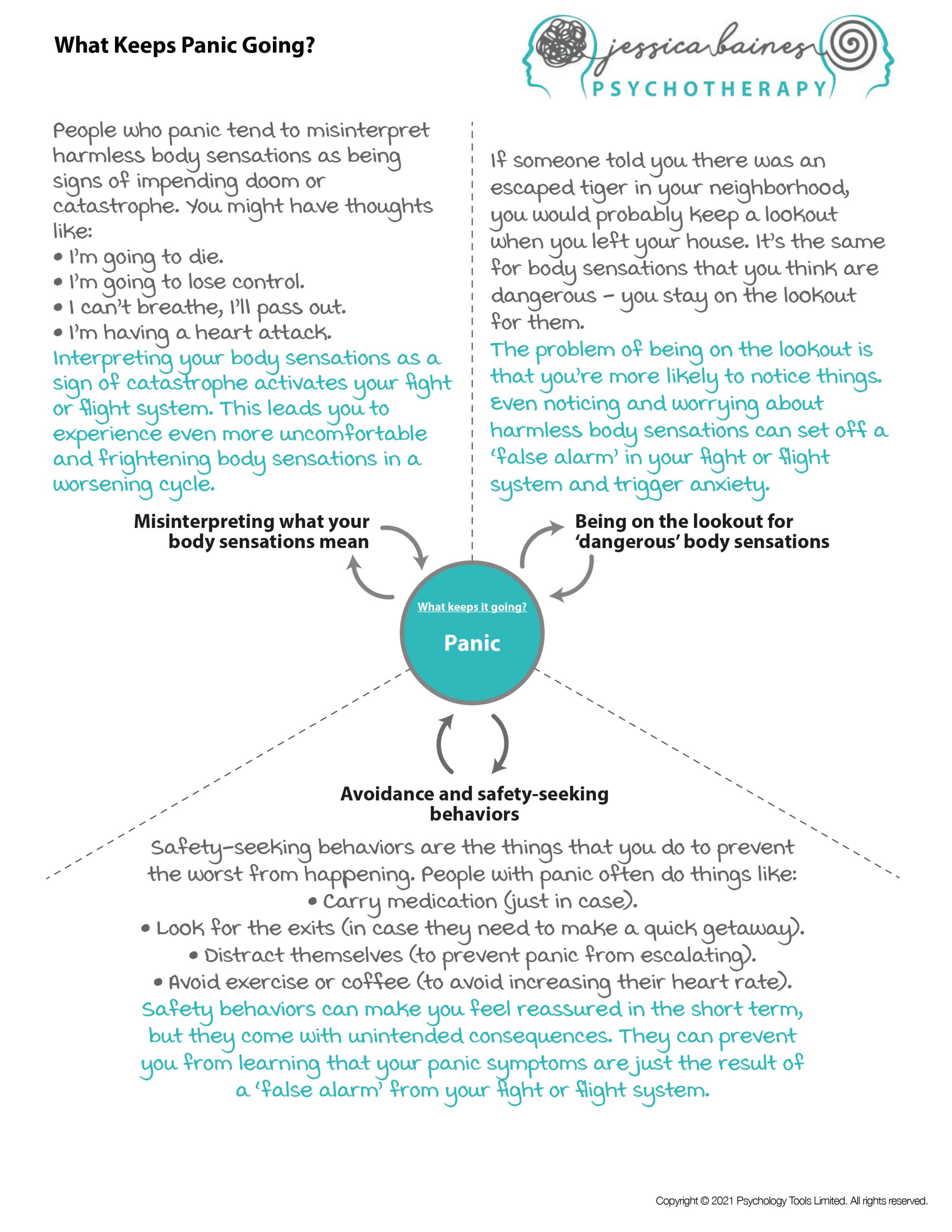 Learn why panic spirals feel so overwhelming, how misinterpreting body sensations fuels fear, and why safety behaviors may make things worse.